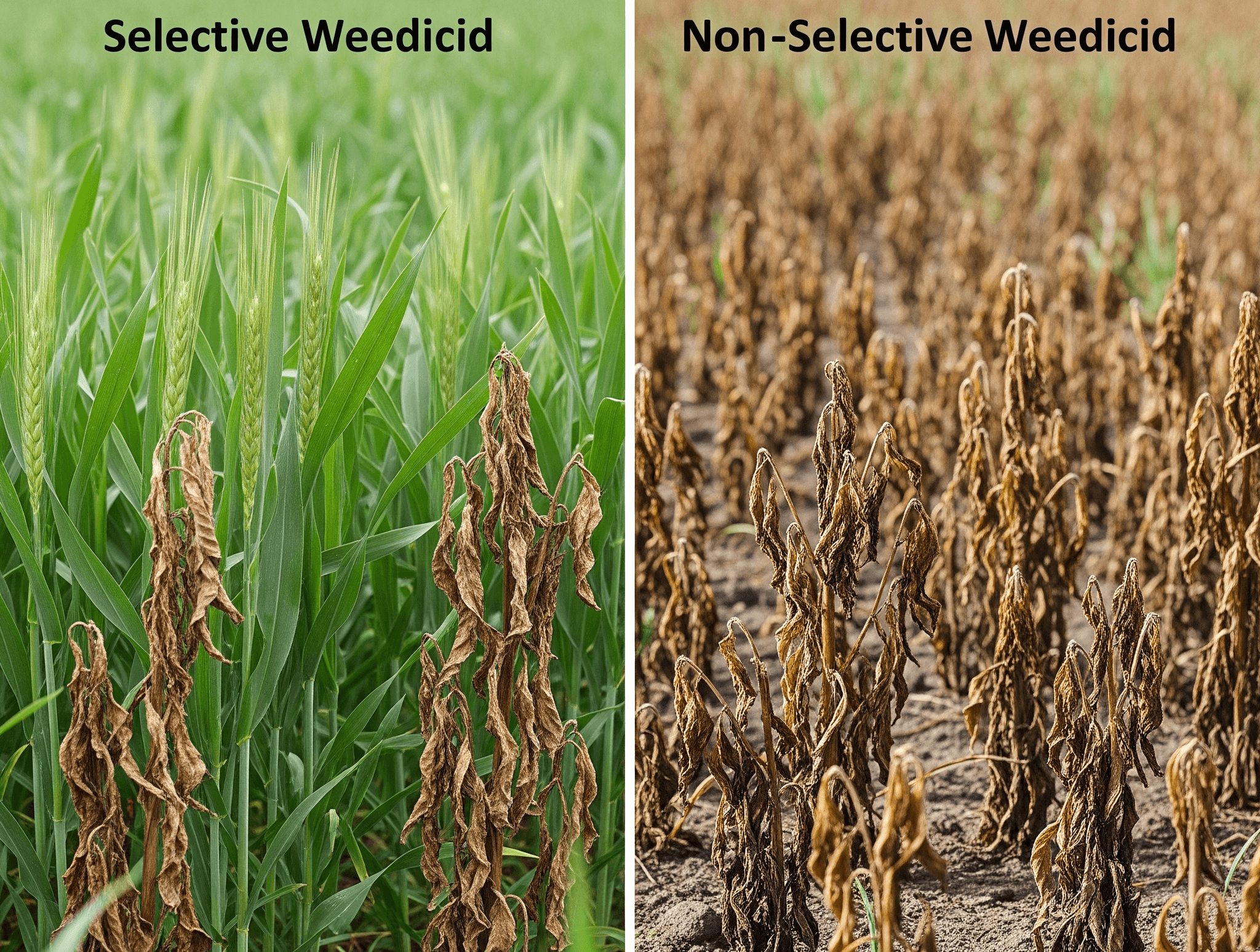 - Non-Selective Herbicides: Kill all vegetation they contact. Used for total vegetation control (pathways, non-crop lands, pre-planting burndown).Example: Paraquat (kills almost all green tissue on contact).