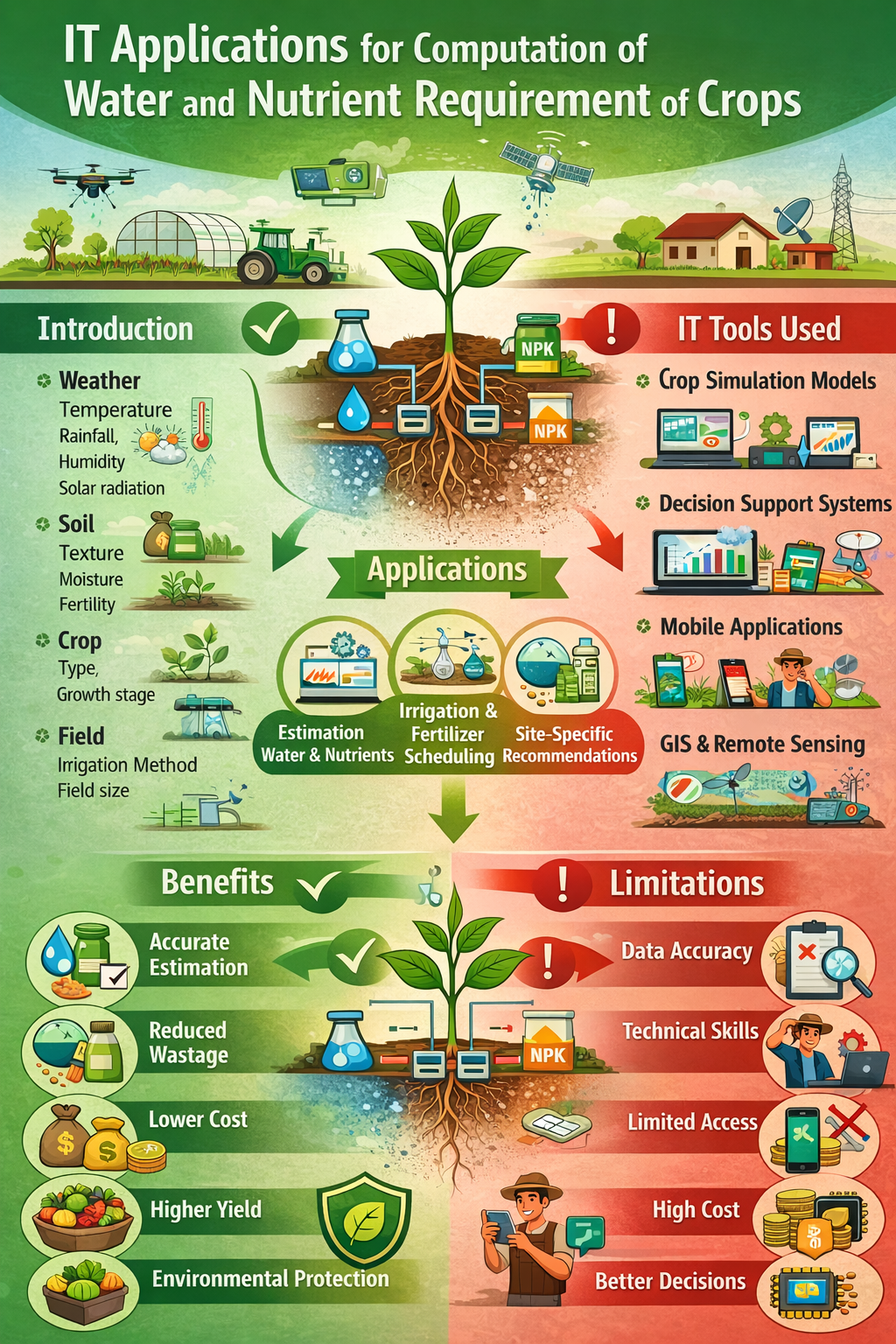 - Efficient management of water and nutrients is critical for achieving higher crop productivity, reducing input costs, and ensuring sustainable agriculture. Information Technology (IT) plays a vital role in computing the exact requirement of irrigation water and nutrients for crops by integrating data related to soil, crop, weather, and management practices.