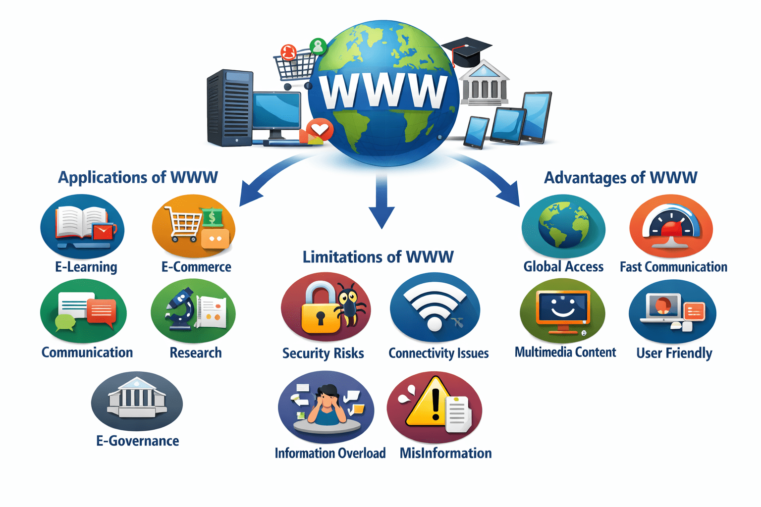 - Education and e-Learning The WWW supports online education through e-learning platforms, digital libraries, online courses, virtual classrooms, and access to study materials anytime and anywhere.