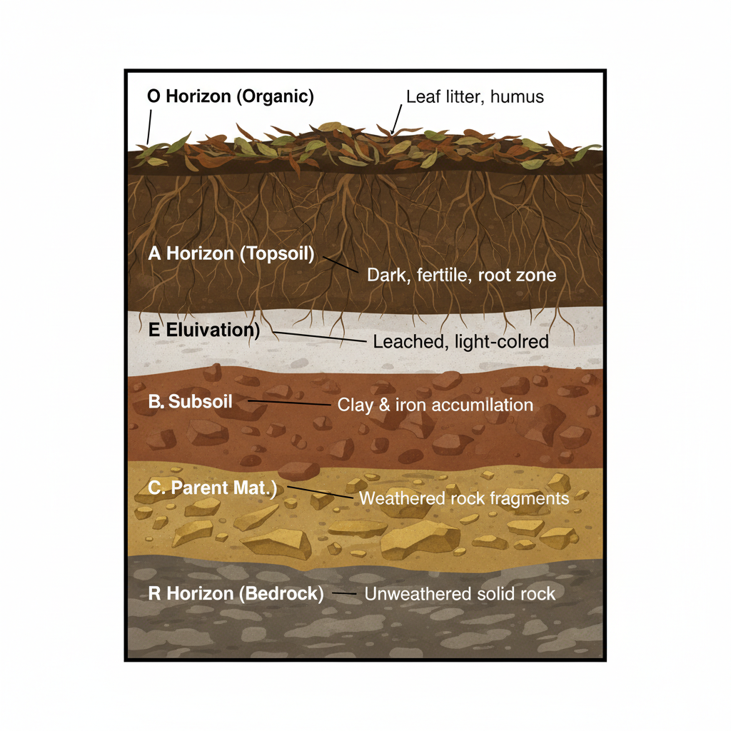 - Importance: Determines texture, structure, and mineral composition of overlying soil horizons.