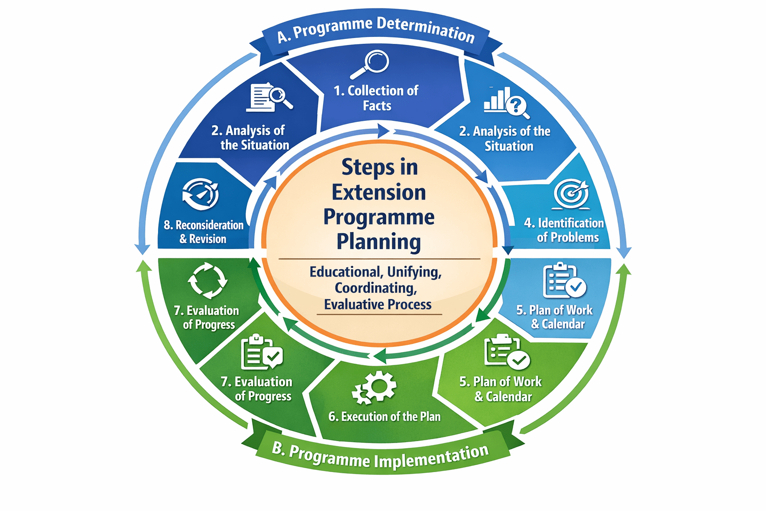 Extension programme planning is a systematic process of identifying needs, setting objectives, organizing resources, implementing activities, and evaluating results to bring desired change among people.