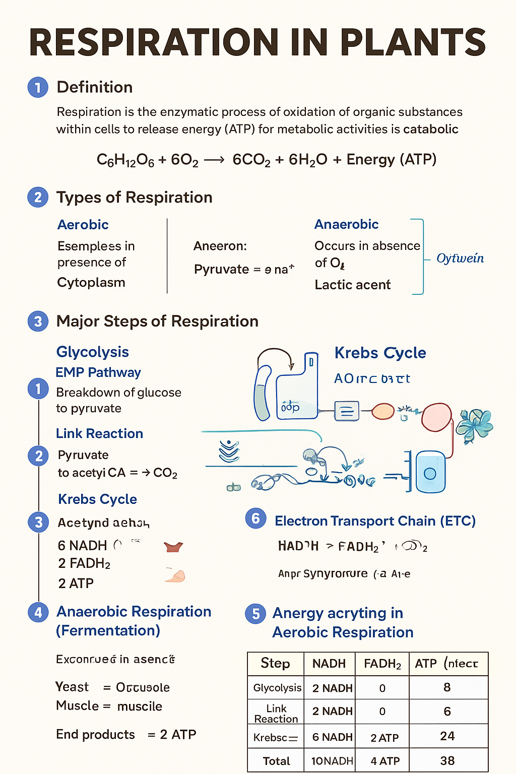 - Anaerobic Respiration – Occurs in the absence of O₂; partial oxidation producing alcohol or lactic acid.